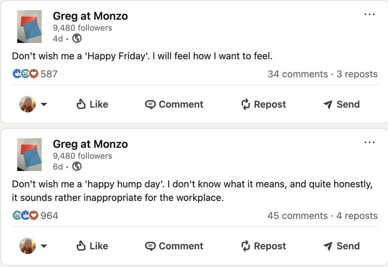Greg at Monzo: This character (created by Monzo’s social team) acts as a grumpy, anti-marketing employee who complains about meetings and office microwaves. He gained 10,000+ followers in one week by being the human voice of the digital bank.